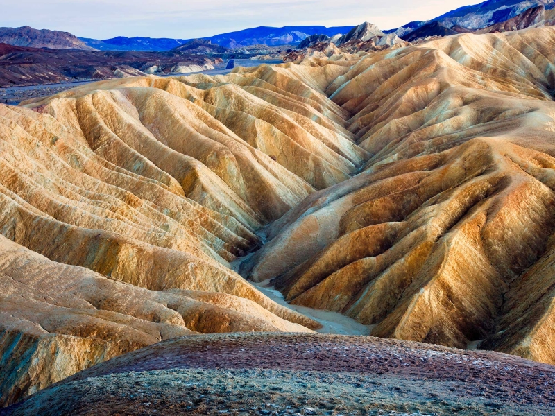 Point de vue iconique de la Death Valley sur des collines jaunes et marrons formées par la force de l’eau et au-delà sur les sols blancs salés qui caractérisent aussi ce lieu désertique.